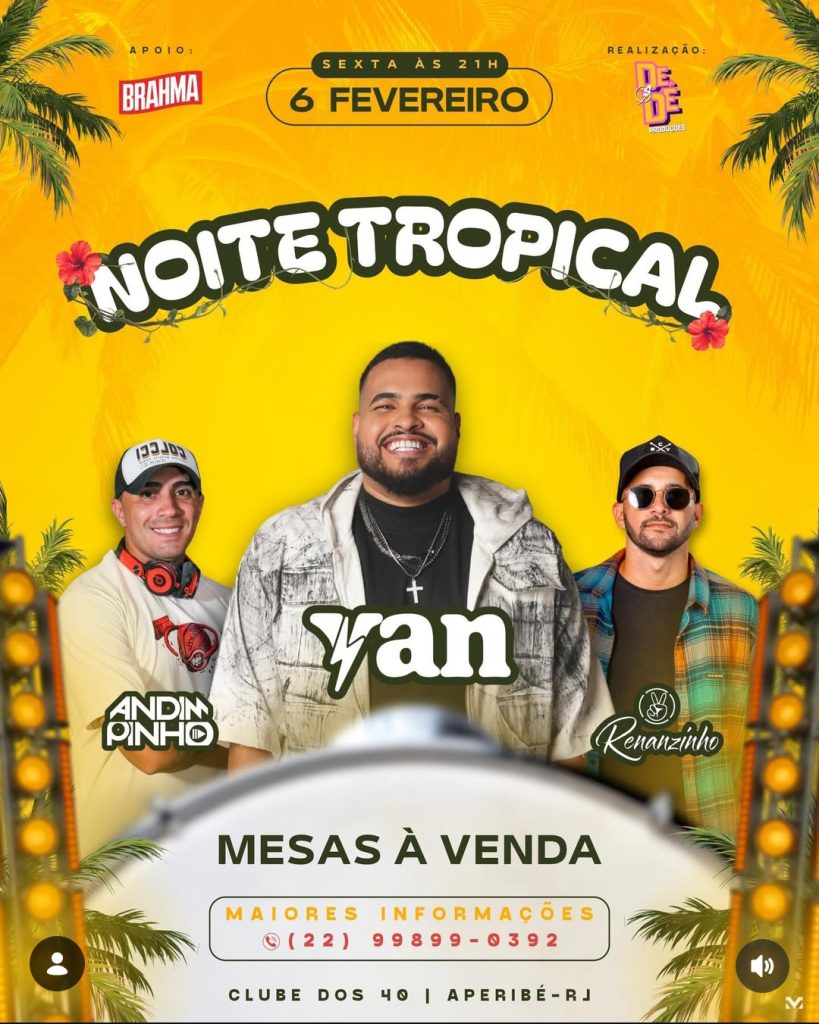 Na sexta-feira, 6 de fevereiro, a partir das 21h, o Clube dos 40 será palco da Noite Tropical, reunindo grandes atrações e um público animado.