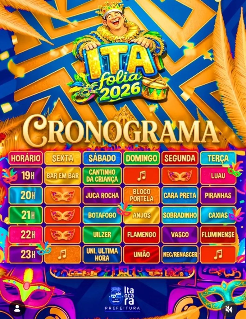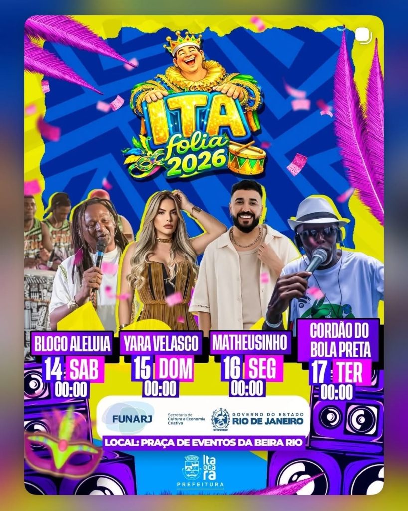 O Ita Folia 2026 promete movimentar Itaocara com uma das maiores festas populares da região. O evento acontece na Praça de Eventos da Beira Rio, com apoio da Prefeitura de Itaocara, da FUNARJ, da Secretaria de Cultura e Economia Criativa e do Governo do Estado do Rio de Janeiro.